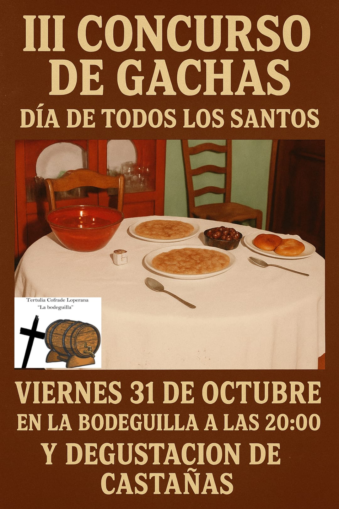 III Concurso de Gachas Loperanas el 31 de Octubre (Próximo Viernes) a las 20 horas en la Tertulia Cofrade Loperana ” La Bodeguilla “. Inscripciones: Escribe a la página, o habla con cualquier miembro de la Tertulia. Bases : Traer un plato de gachas ya cocinado, y tapado con papel albal. Poner el nombre pegado debajo del plato. En el desarrollo del evento se degustaran 5 Kilos de castañas asadas para los asistentes obsequio de José Martín y María Girón.